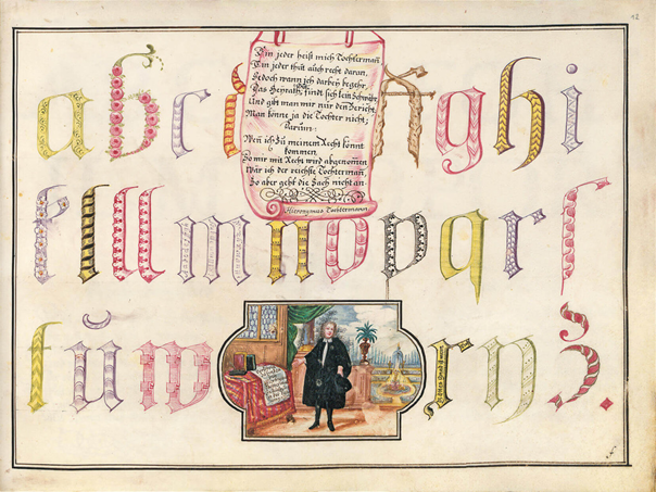 Das Kalligraphiebuch des Hieronymus Tochtermann mit seiner reichen Auswahl an Schreib- und Zierschriften spiegelt in den zart kolorierten und phantasievoll gestalteten Blättern die heitere Leichtigkeit und die verspielte Eleganz des Rokoko wider. Das gilt gleichermaßen für die schwungvollen Schnörkel der Buchstaben und die bunten Vignetten, die die einzelnen Schriftproben illustrieren. Dabei handelt es sich um kurze Texte zur Andacht, Belehrung und geistreichen Unterhaltung.